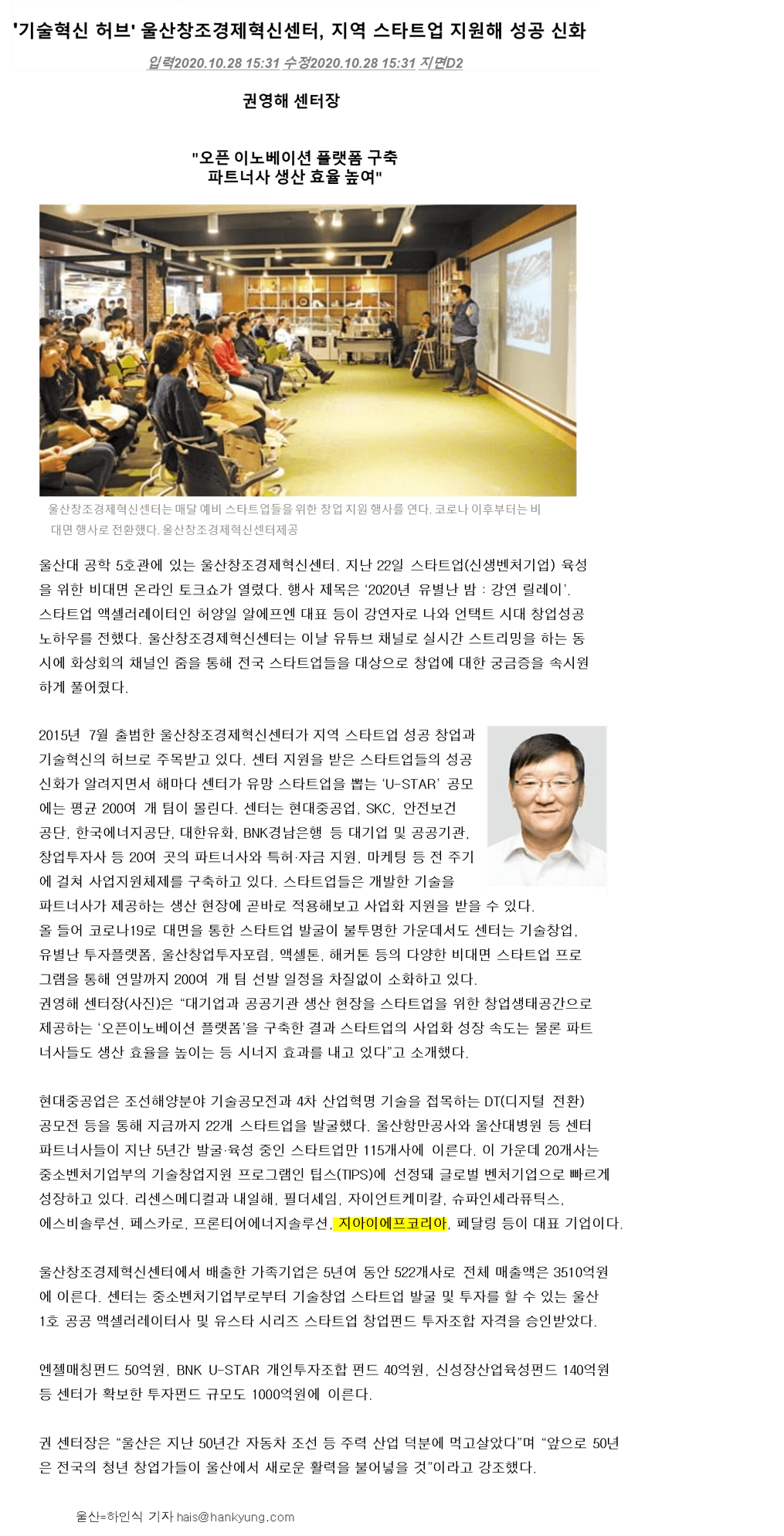 'Technology Innovation Hub' Ulsan Creative Economy Innovation Center supports local startups to create a success myth.