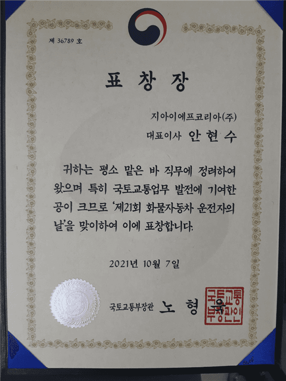 지아이에프코리아 안현수 대표님, 국토부장관 표창장 수상을 진심으로 축하드립니다!